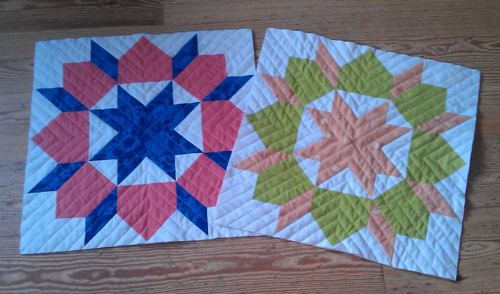 This was a Blogger's BOM from 2012, with contribution from 13 different designers. The quilt is a lap size, perfect for the newly weds to cuddle under. If you click on the picture, you will be able to see the quilting. It consists of a combination of FMQ and straight lines using the walking foot.
